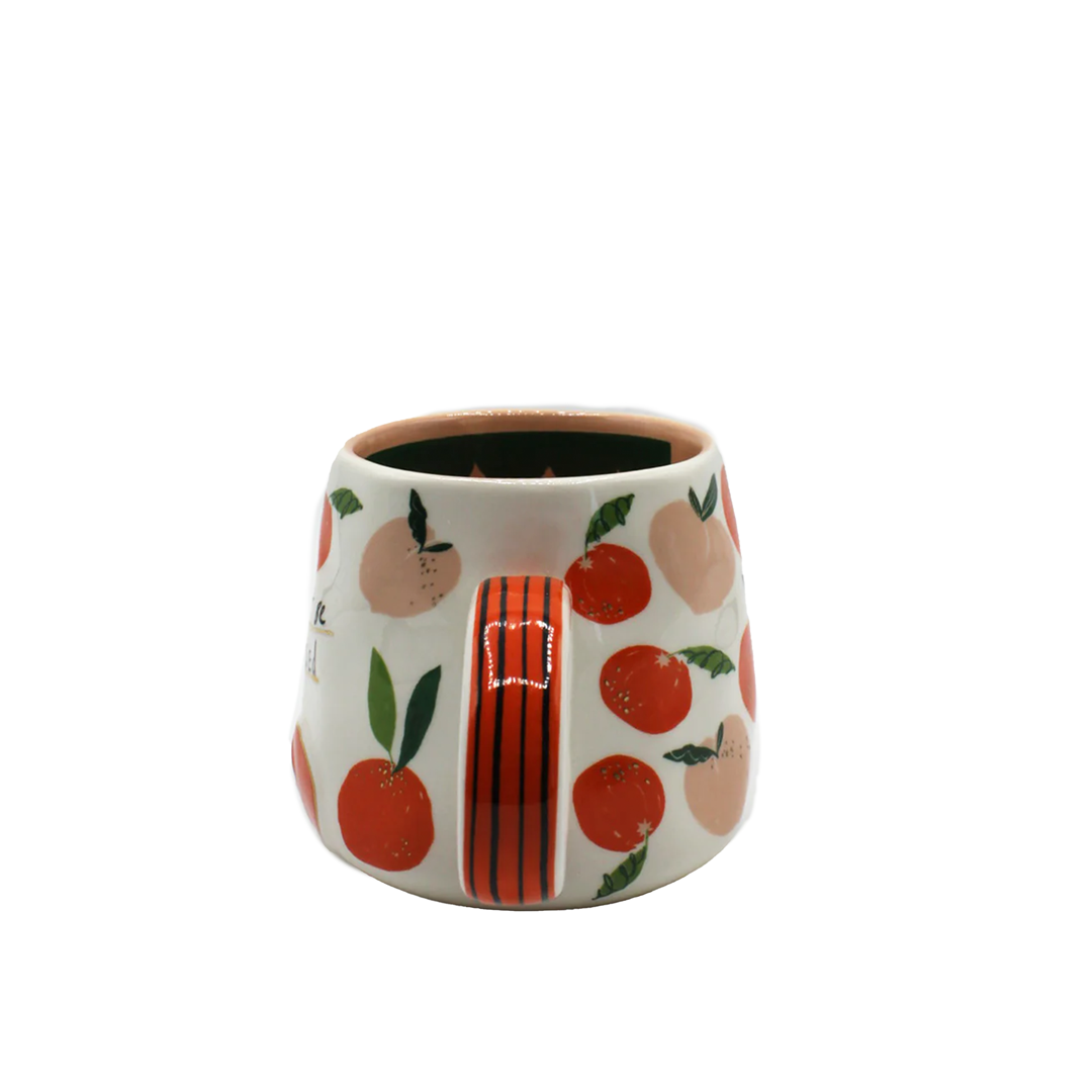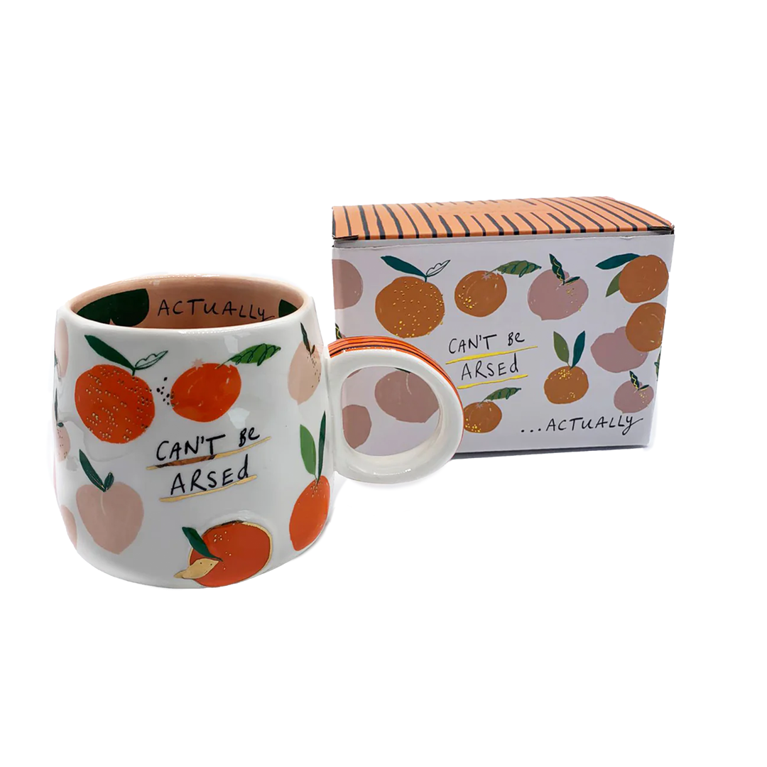 Get your caffeine fix in this quirky little mug! This cutie has a battered handmade feel, and might look a little wonky... but don't worry, it's supposed to! Covered all over in a peachy pattern, with a 3D peach on the front, this mug also holds a secret message that starts on the front and finishes on the inside! This little memo reads "Can't be arsed - actually". It would make a lovely gift for a friend with a good sense of humour.