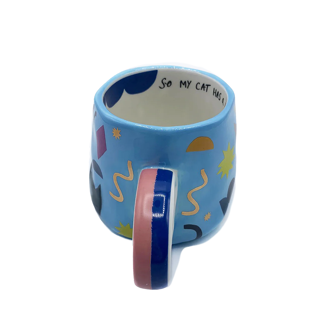 This quirky little mug is crafted with a handmade battered feel - the wonkiness is all a part of the charm! Featuring an all-over playful print print, with a 3D cat face, this mug holds a secret message on the inside. This little note reads “I work hard…so my cat has a better life”. Who else can relate?
