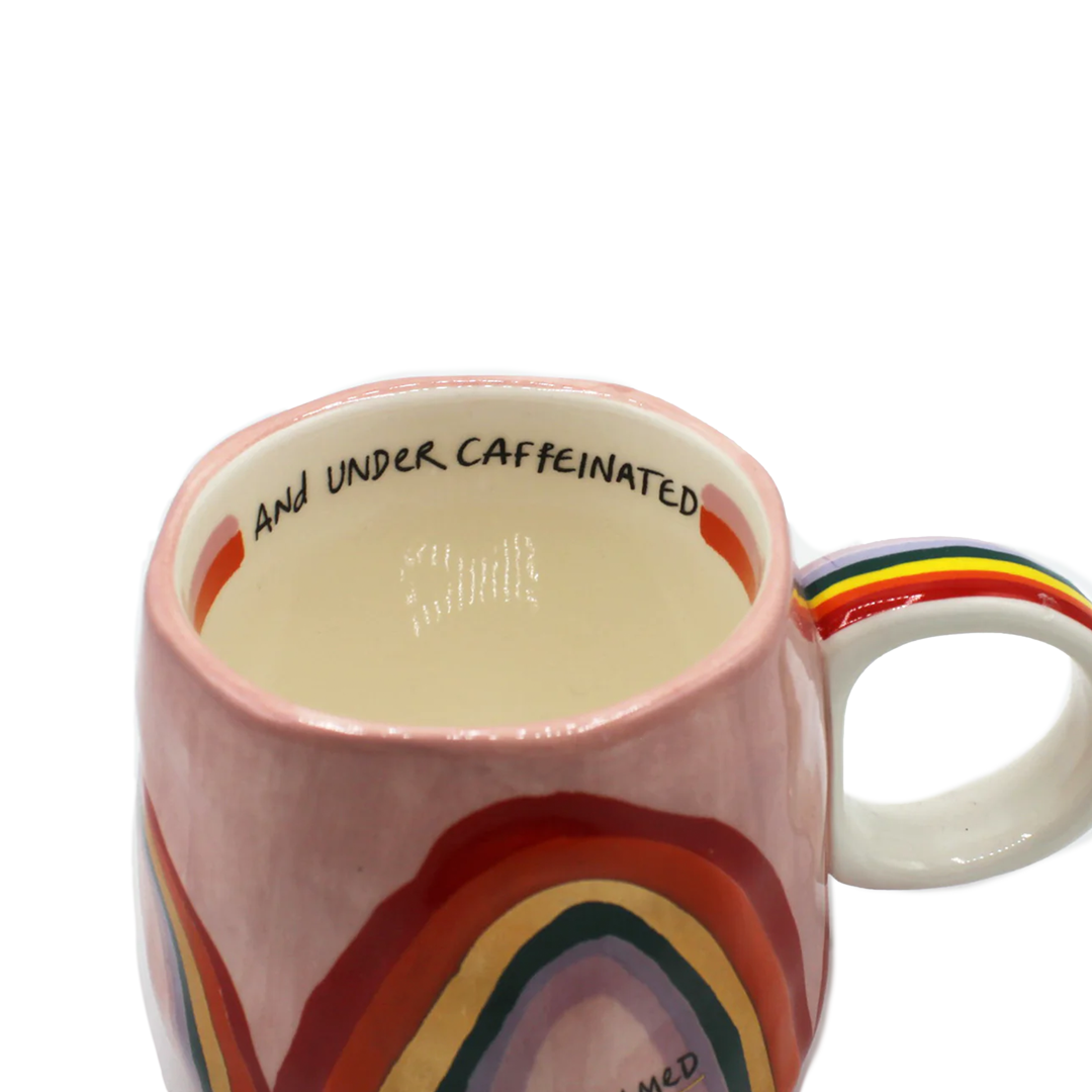 Get your caffeine fix in this quirky little mug! This cutie has a battered handmade feel, and might look a little wonky... but don't worry, it's supposed to! Illustrated with a big rainbow print, with a 3D element on the front, this mug also holds a secret message that starts on the front and finishes on the inside! This little memo reads "Overwhelmed - and under caffeinated". It would make a lovely gift for a friend with a good sense of humour.